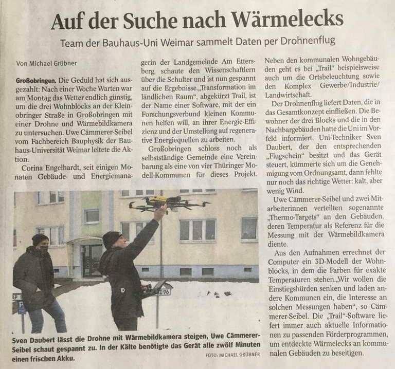 Für die Bewertung des energetischen Zustandes der Gebäudehülle sind zunächst Aufnahmen von außen notwendig. Diese wurden in Großobringen für drei Gebäude aus der Luft mit einer Drohne erstellt, aus einer Höhe zwischen 40 und 45 Metern und mit einem Winkel von ca. 30° sowohl im sichtbaren als auch im infraroten Spektrum. Ziel ist es, aus den erfassten Daten Maßnahmen für eine verbesserte Energieeffizienz der Gebäude abzuleiten. Die Daten werden im Laufe des TRAIL²-Projektes ausgewertet und sollen zu einem späteren Zeitpunkt auch im Rahmen z.B. einer Bürgerveranstaltung oder im Gemeinderat präsentiert werden. Über die Befliegung ist ein Artikel in der Thüringischen Landeszeitung erschienen, dieser ist hier abgebildet (Bildquelle: Michael Grübner, TLZ-Beitrag vom 27.01.2021).